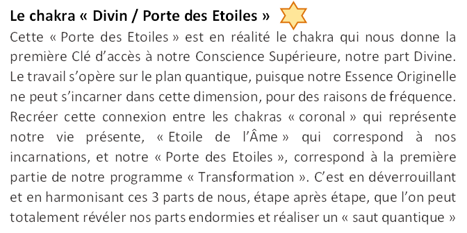 Un autre chakra a une importance capital dans le travail de développement personnel. ll s'agit de celui qui est nommé "Etoile de la Terre", destiné à augmenter notre ancrage dans la matière, alors qu'autour de nous toutes les fréquences vibratoires sont en pleine expansion.
